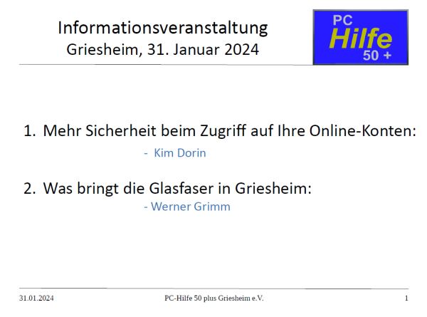 Unser Beratungsjahr 2024 sollte am 17. Januar 2024 mit der schon traditionellen öffentlichen Info-Veranstaltung beginnen. Das angekündigte Extremwetter mit Glatteis und Schnee veranlasste uns, sie auf den 31. Januar zu verschieben. Wieder war die Veranstaltung von vielen Gästen und Mitgliedern besucht. Es wurden zwei Themen vorgestellt, die auf großes Interesse stießen: die "2-Faktor-Authentisierung", abgekürzt: "2FA", und der flächendeckende Ausbau des Glasfasernetzes in Griesheim mit seinen Möglichkeiten und Kosten für Anwender.